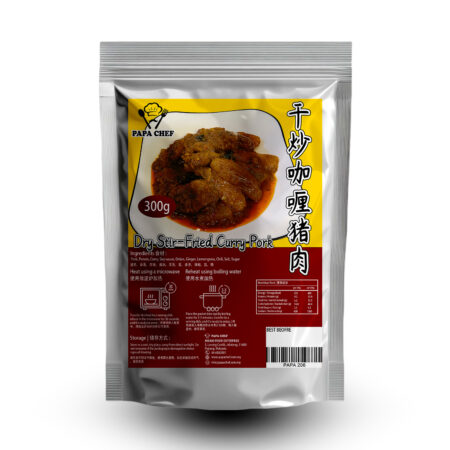 Papa Chef’s Dry Curry Pork Stir-Fry features tender pork belly stir-fried with potatoes in a rich, fragrant curry sauce. The Nyonya-style curry blend delivers a nostalgic kick of spice and flavor, while the pork remains juicy and satisfying. This dish is a perfect blend of savory heat and traditional taste.