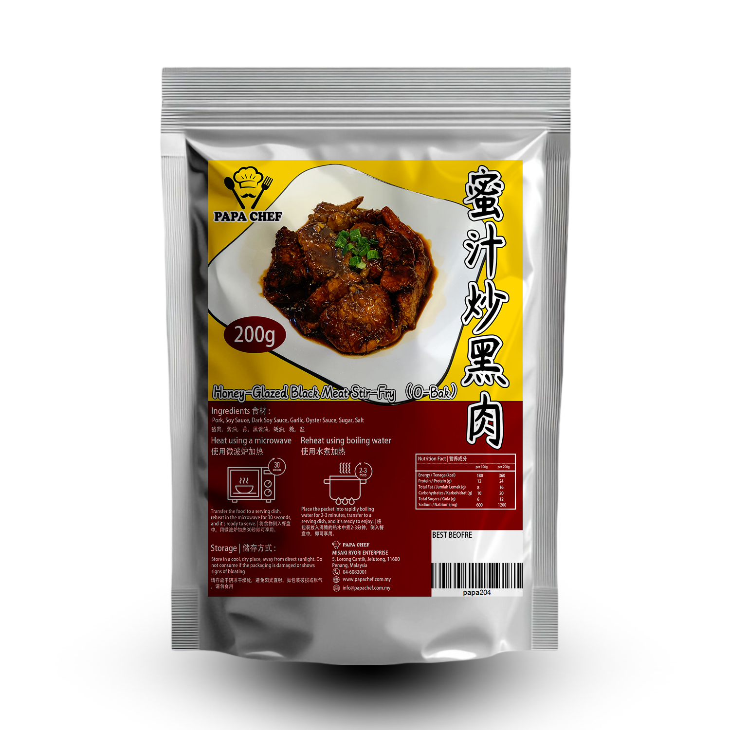 Papa Chef’s Honey-Glazed Black Meat (O-Bak) features lean, sliced pork stir-fried in a rich honey glaze. Unlike fatty cuts, this version uses no pork belly — just tender lean meat, perfectly cooked to soak up the sweet-savory sauce. The result is a nostalgic home-style dish with bold flavor and no greasy aftertaste.